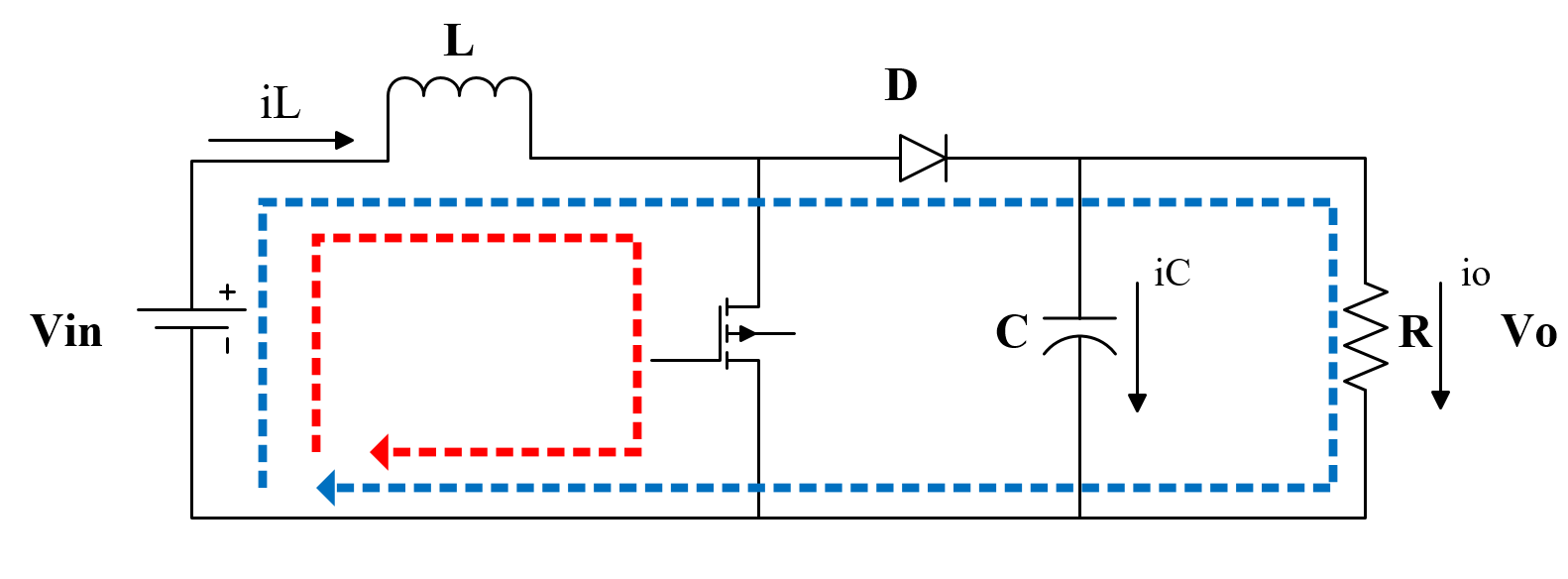 The boost converter has two operating modes, as shown in Fig. 1. When the switch is in the ON position (red line), the circuit consists of the input voltage and the inductor. In this mode, the inductor stores energy in the form of electric current. The longer the switch is closed, the larger the current stored in the inductor. When the switch is in the OFF state, the stored current in the inductor flows directly to the diode and the capacitor (blue line). As a result, the capacitor voltage becomes higher than the input voltage.