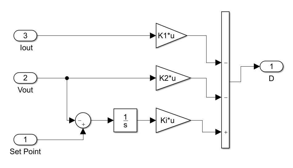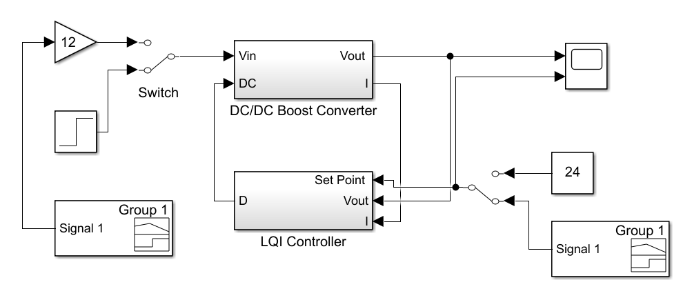 In the MATLAB simulation, the boost converter acts as the plant and its duty cycle is the control signal. The LQI controller will generate the duty cycle to achieve the desired output voltage.