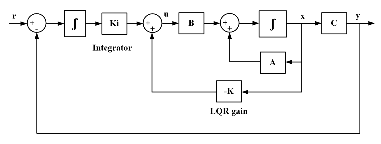 In principle, LQI is an extension of the LQR controller with the addition of an integrator. LQI is compatible to use for servo control system (system with a non-zero set-point). LQI utilizes optimal control that allows for reference signal tracking and disturbance rejection. The block diagram of the LQI controller is shown in Fig. 2. In the block diagram, there are matrices