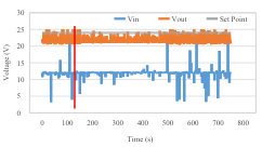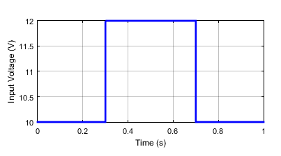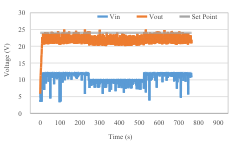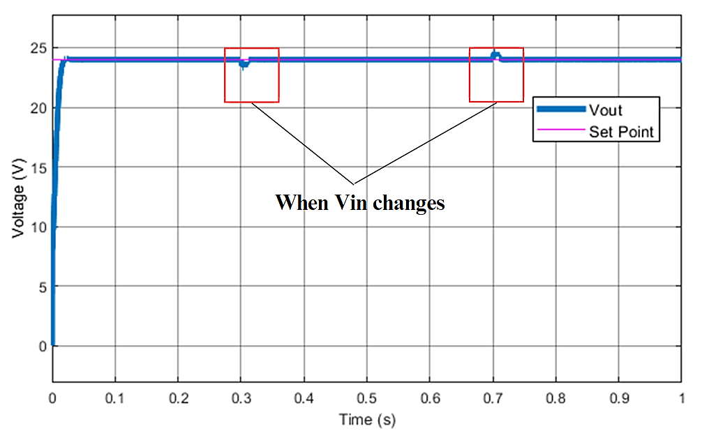 The simulation in the input change testing scenario is conducted to observe the control performance when the input voltage is not constant. The input voltage is changed by adjusting it from 12 V to 10 V and then back to 12 V as shown in Fig. 5. The simulation is carried out with a set point of 24 V.