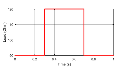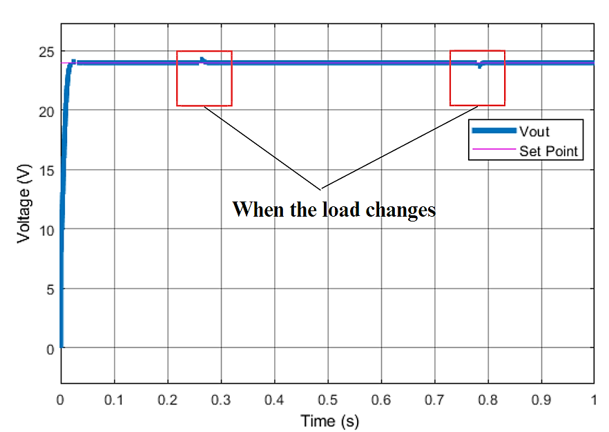 The second simulation test with the load change condition is conducted to observe the control performance when the load is not constant. The load variation is achieved by using resistance of 90 Ω and 120 Ω, as shown in Fig. 7. The simulation is carried out with a constant input voltage of 12 V and a set point of 24 V.