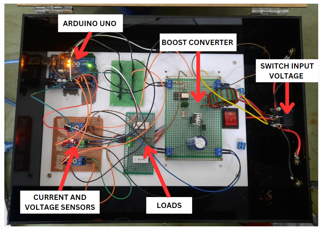 The hardware realization of the DC-DC boost converter control system can be seen in Fig. 9. The DC input voltage is connected to the boost converter circuit. Then, voltage and current sensors are used to measure the state variables of the boost converter. The output from these sensors is converted into 10-bit ADC values, which will be read by the Arduino Uno microcontroller. In this board, the LQI controller is embedded and will generate the PWM signal to drive the MOSFET in the boost converter circuit.